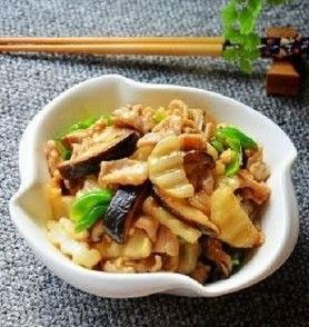 2、炒鍋倒油爆香蔥姜,倒肉片炒變色盛出。底油放香菇、山藥、加生抽、糖