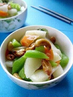 小貼士:萵筍含鉀量較高,有利于促進(jìn)排尿,對高血壓和心臟病極為有益。能改善消化系統(tǒng),增進(jìn)食欲山藥有健脾,除濕,補(bǔ)氣,益肺,固腎,益精的功效。含有可溶性纖維,能助消化,降血糖 腰果含有豐富的油脂,可以潤腸通便,潤膚美容,延緩衰老。經(jīng)常食用可以提高機(jī)體抵抗力。
