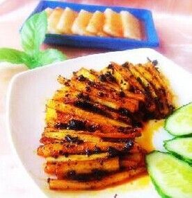 2、熱油熗鍋,倒入一勺切碎的豆豉炒香后,加點辣椒油,倒入山藥條,加點鹽、糖、雞精,勾點薄茨翻炒出鍋裝盤即可。