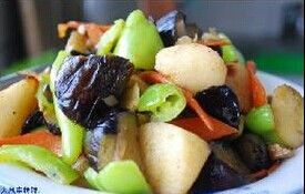 蔥姜蒜爆鍋,炒胡蘿卜,2分鐘后,加茄子,山藥,最后加辣椒,雞精,鹽,